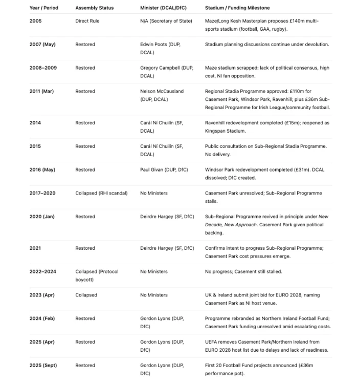 Once the Maze project collapsed, calls quickly came to ensure Northern Ireland still benefited from the Olympic Legacy, even without hosting - sounds familiar? When Casement Park fell out of Euro 2028 contention, the same script was dusted off: legacy without the games.