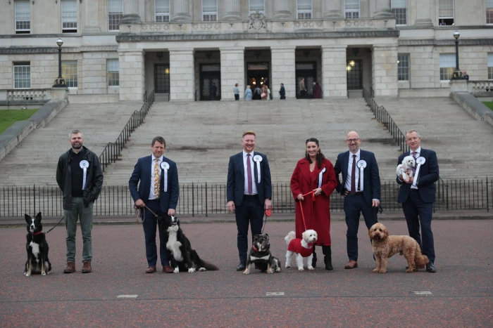 MLAs and their dogs: Gerry Carroll, Laoise; Andrew McMurray, Rey; Daniel McCrossan, Hudson; Emma Little Pengelly, Ruby; Peter Martin, Maxwell; Brian Kingston, Rosie.